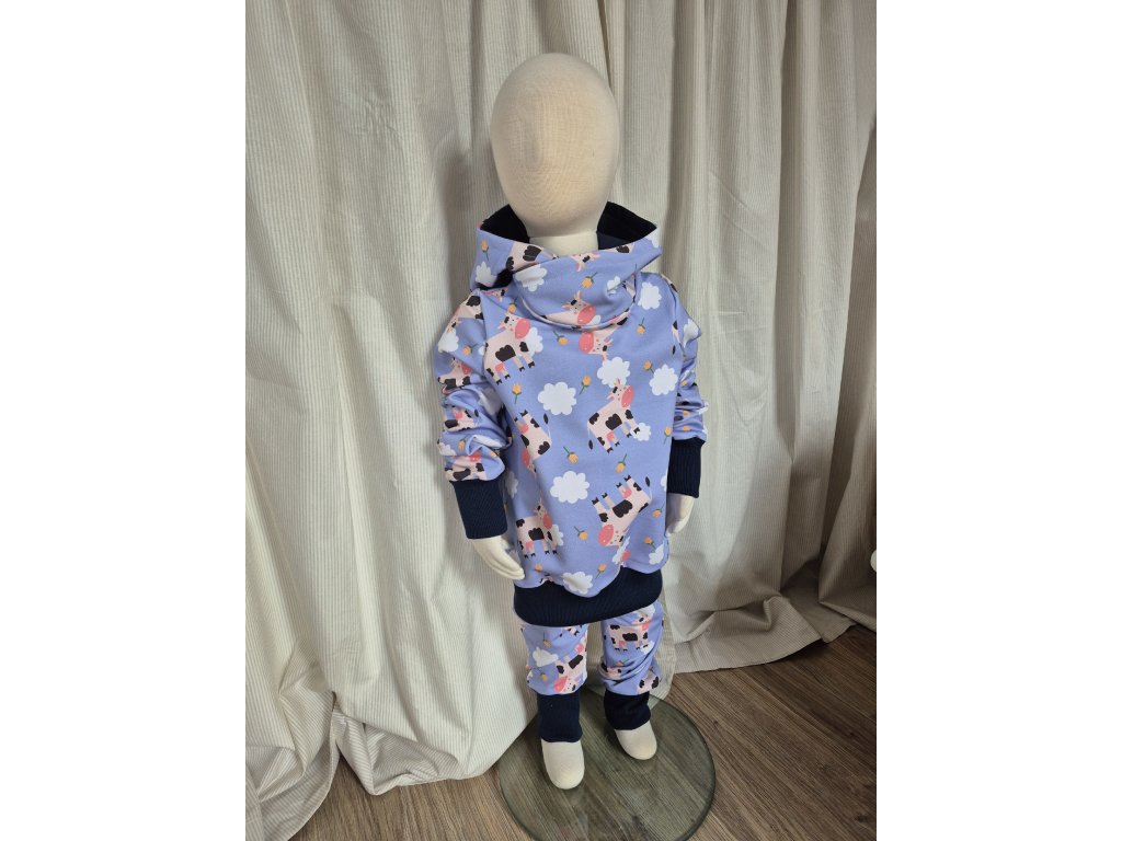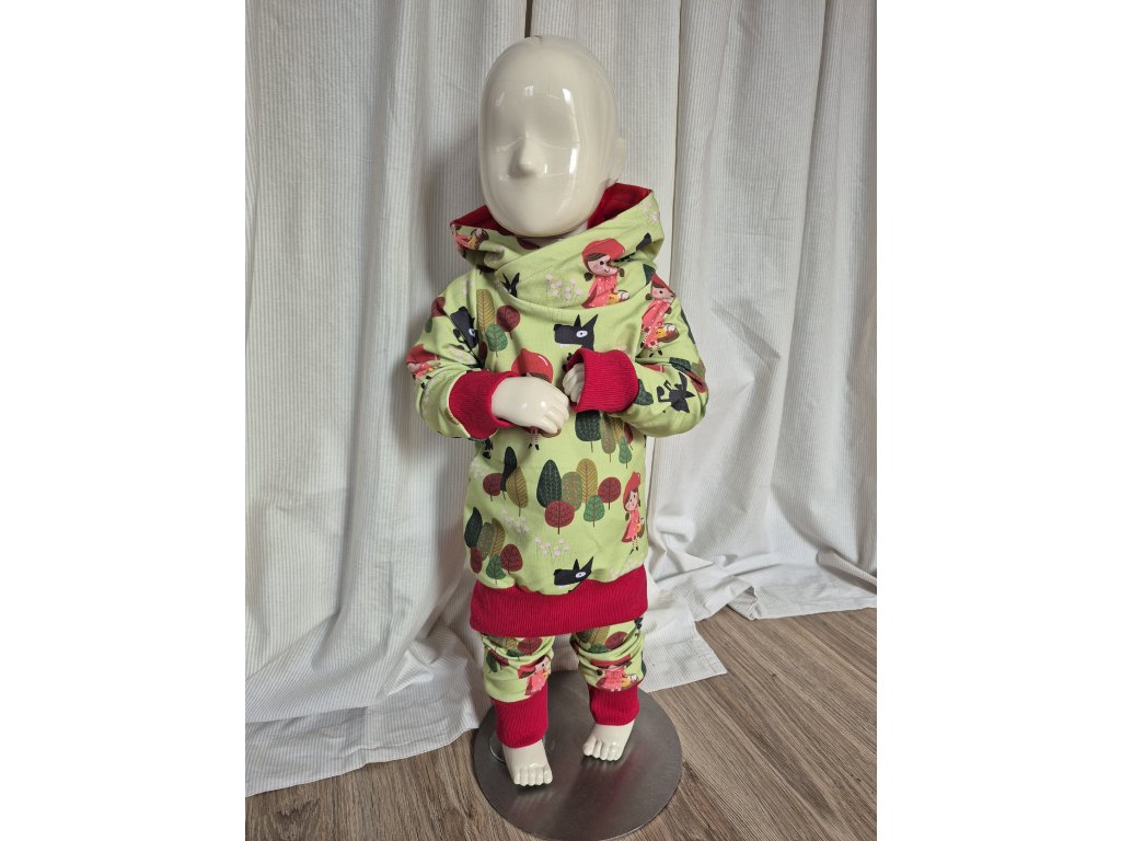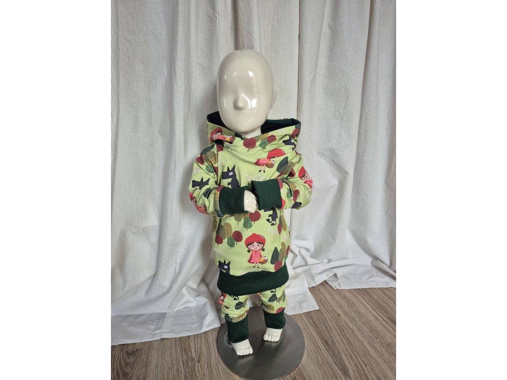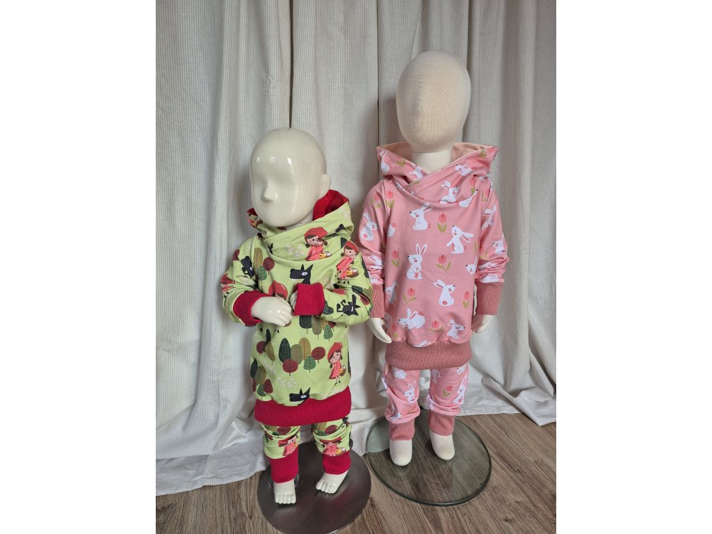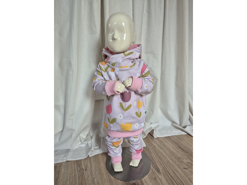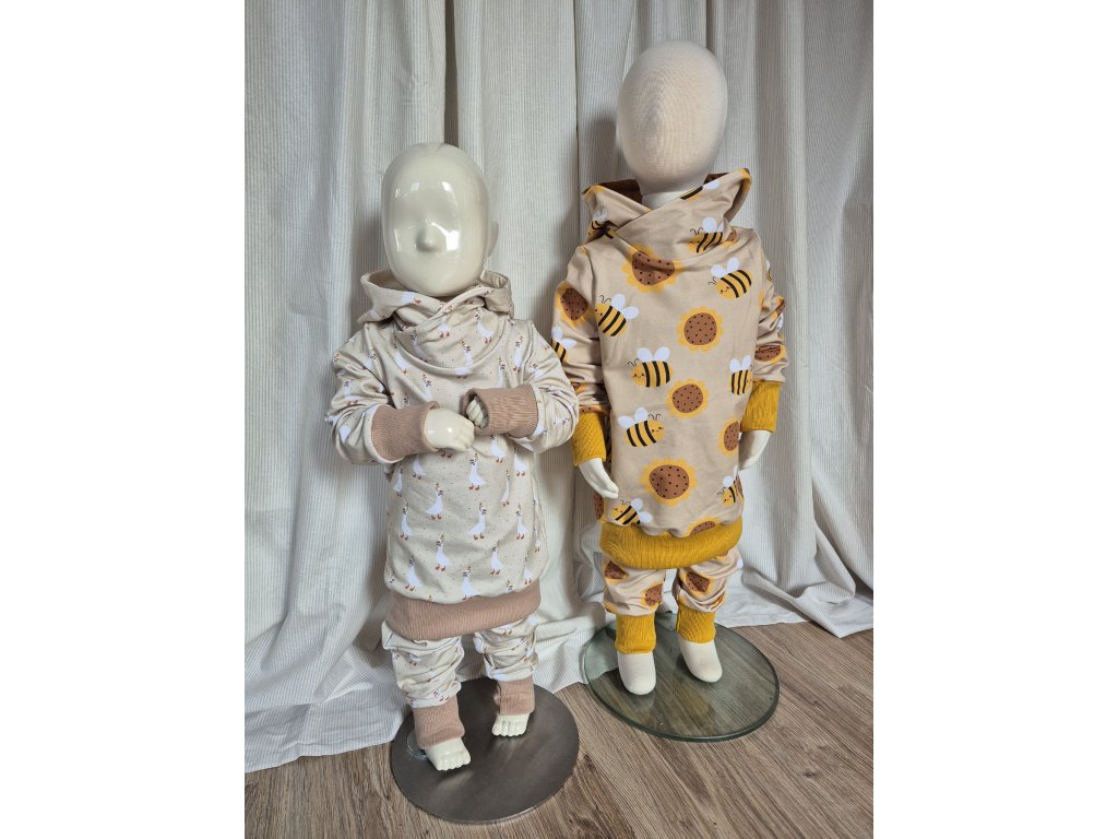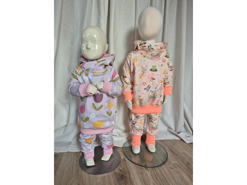 Rostoucí teplákovka. Vysoký náplet v pase tepláčků v kombinaci s prodlouženou délkou mikiny zaručí ,že při čupnutí nelezou záda. Překřížená kapuce hezky chrání krk před ofouknutím. Velikosti jsou větší než klasická konfekce v obchodech.