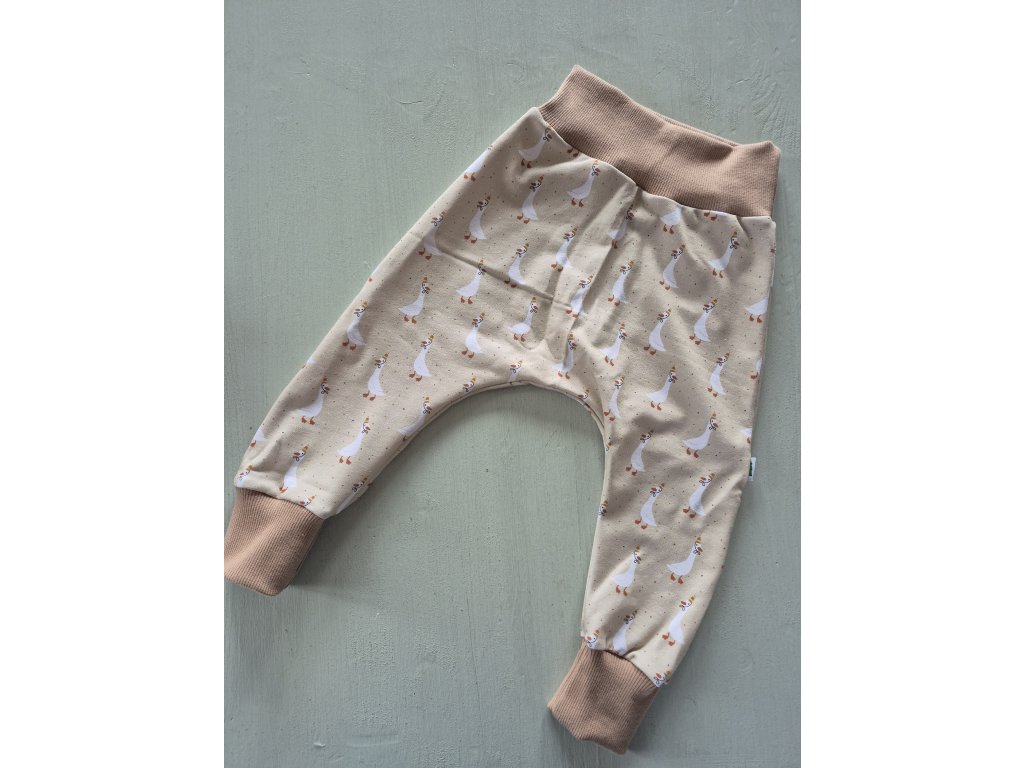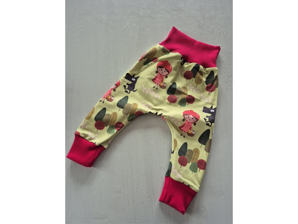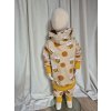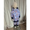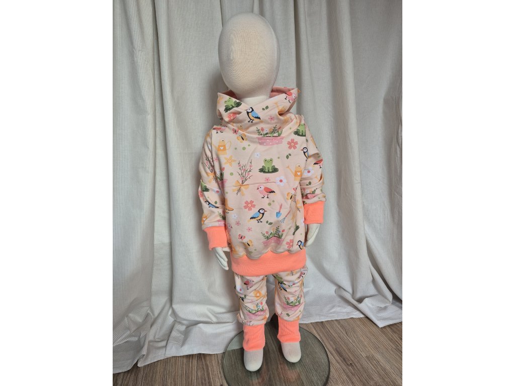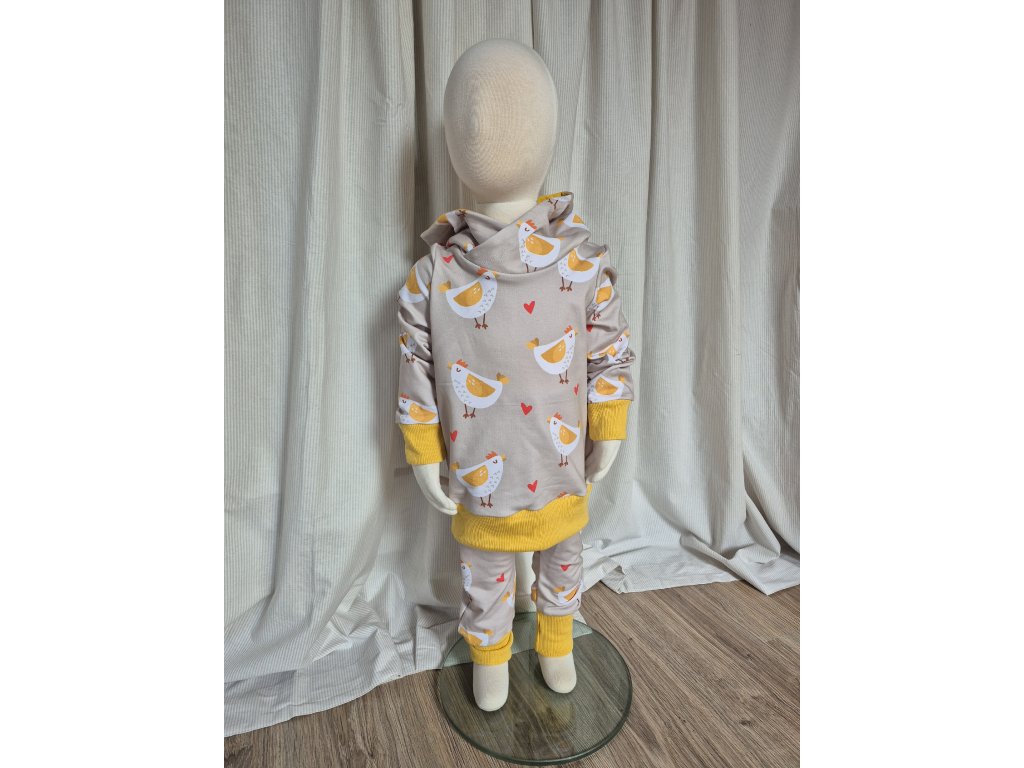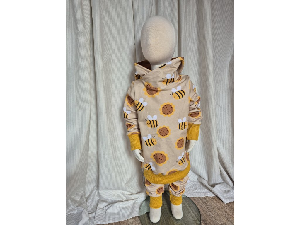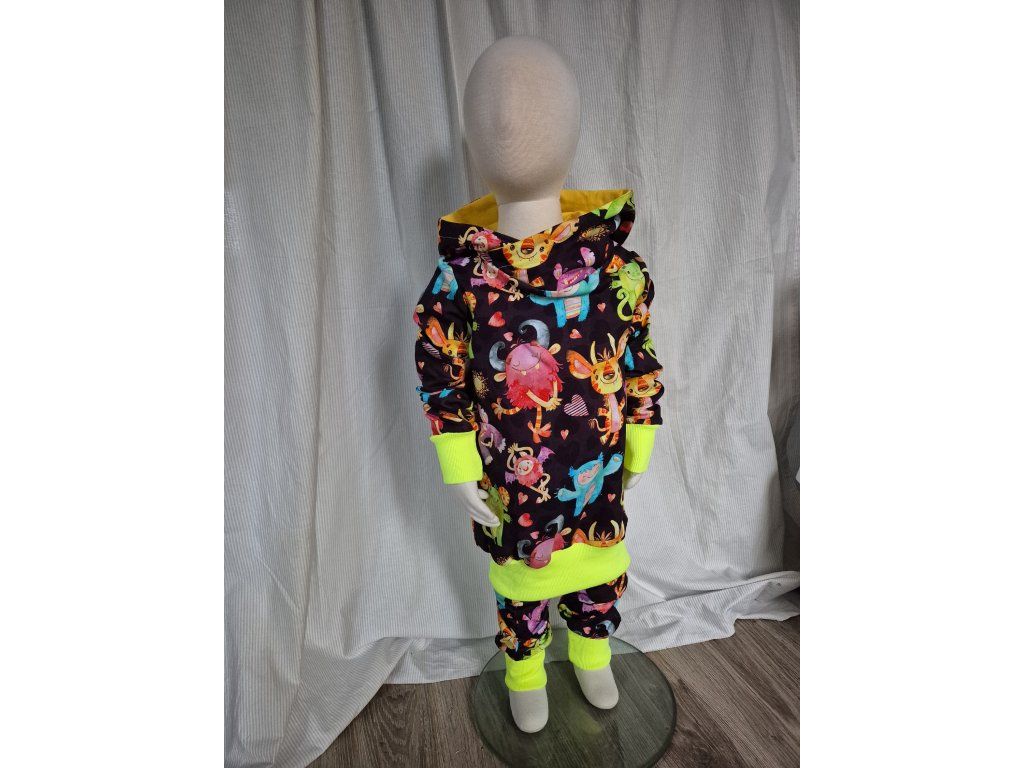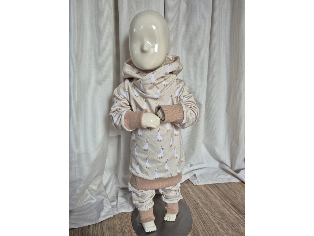 Rostoucí teplákovka. Vysoký náplet v pase tepláčků v kombinaci s prodlouženou délkou mikiny zaručí ,že při čupnutí nelezou záda. Překřížená kapuce hezky chrání krk před ofouknutím. Velikosti jsou větší než klasická konfekce v obchodech.
